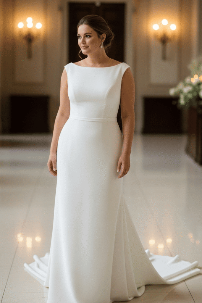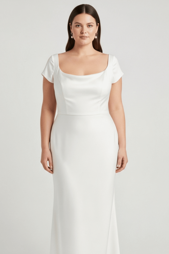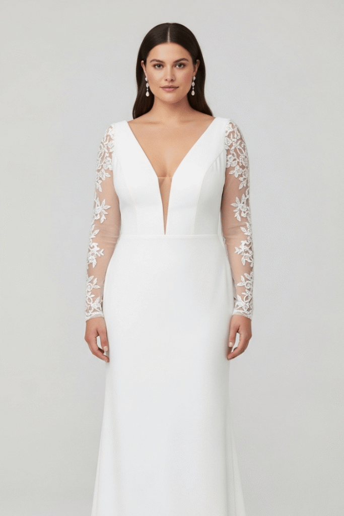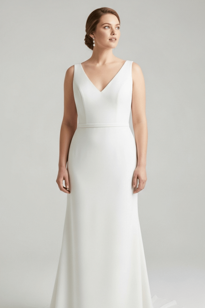 Minimalist gowns allow the fabric, fit, and craftsmanship to shine. Rather than relying on heavy embellishment, these dresses highlight natural form and movement. Bridal trend reports from 2024–2026 show that “modern minimalism” continues to dominate plus-size fashion lines, featuring sleek crepe, mikado, and satin fabrics that sculpt the body without extra volume.