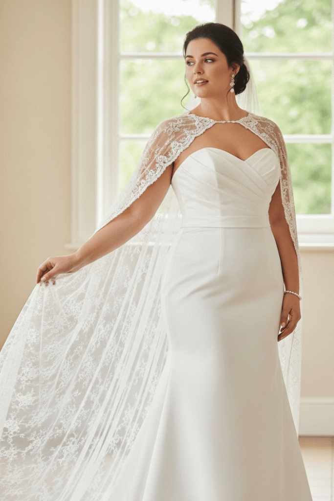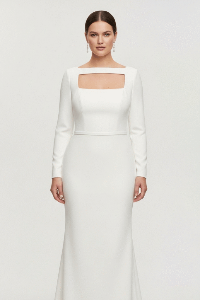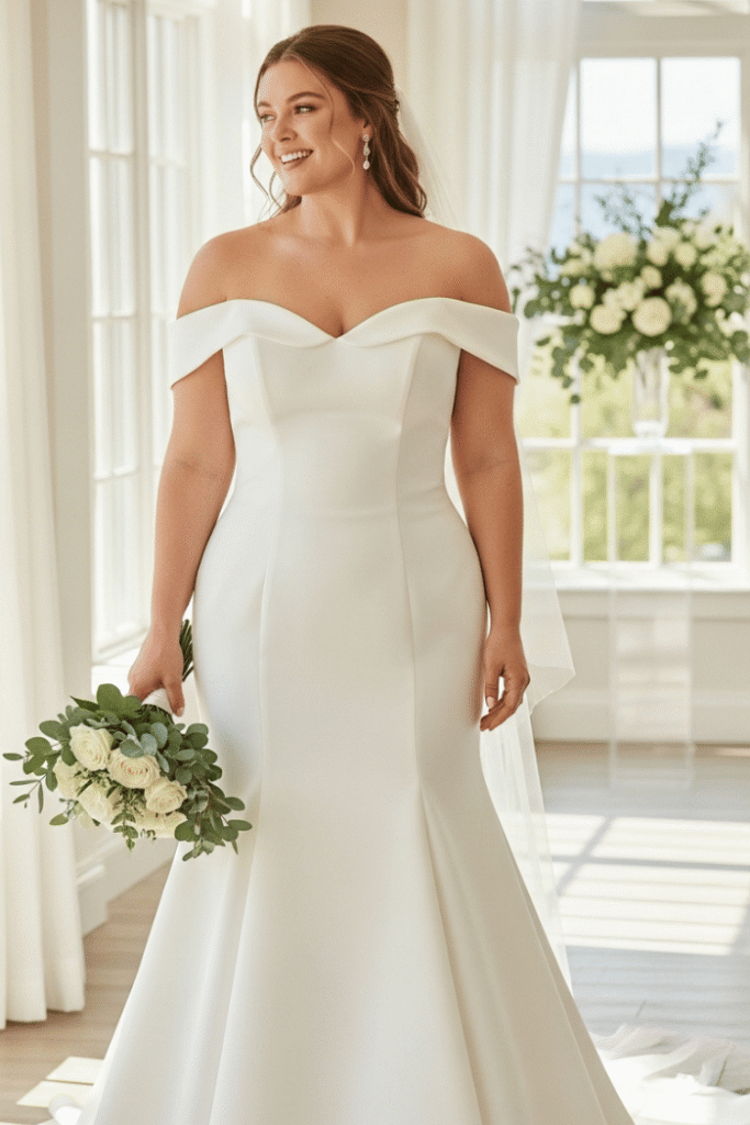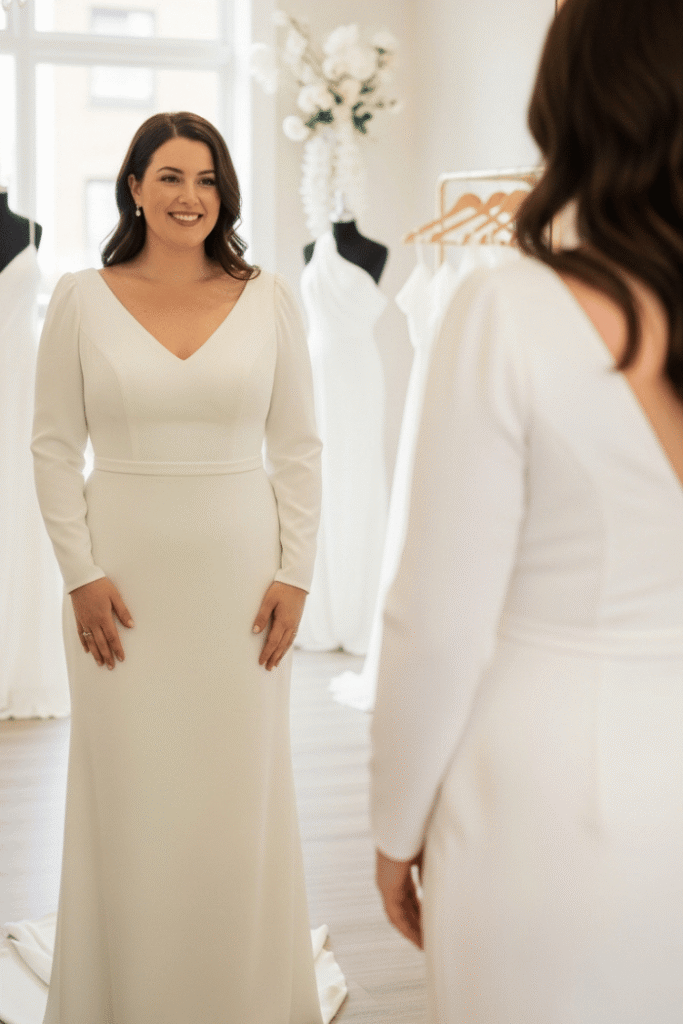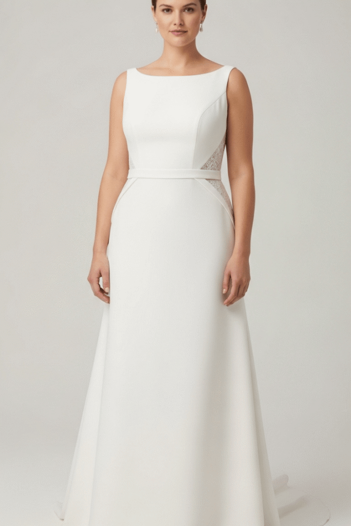 Minimalist gowns allow the fabric, fit, and craftsmanship to shine. Rather than relying on heavy embellishment, these dresses highlight natural form and movement. Bridal trend reports from 2024–2026 show that “modern minimalism” continues to dominate plus-size fashion lines, featuring sleek crepe, mikado, and satin fabrics that sculpt the body without extra volume.