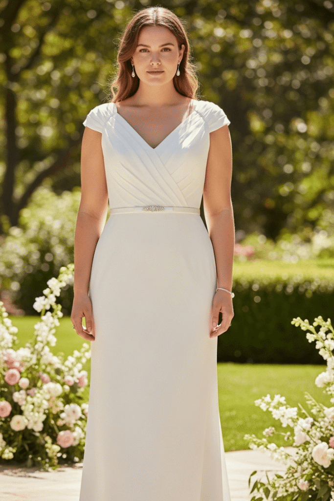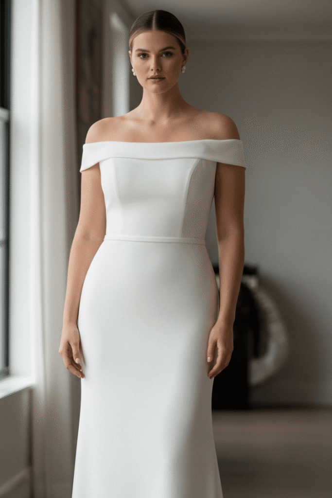Crepe fabric adds light structure that skims curves without clinging. This design works beautifully for pear-shaped and hourglass brides who prefer a classic yet refined silhouette. Pair it with pearl earrings and a soft updo for understated charm.