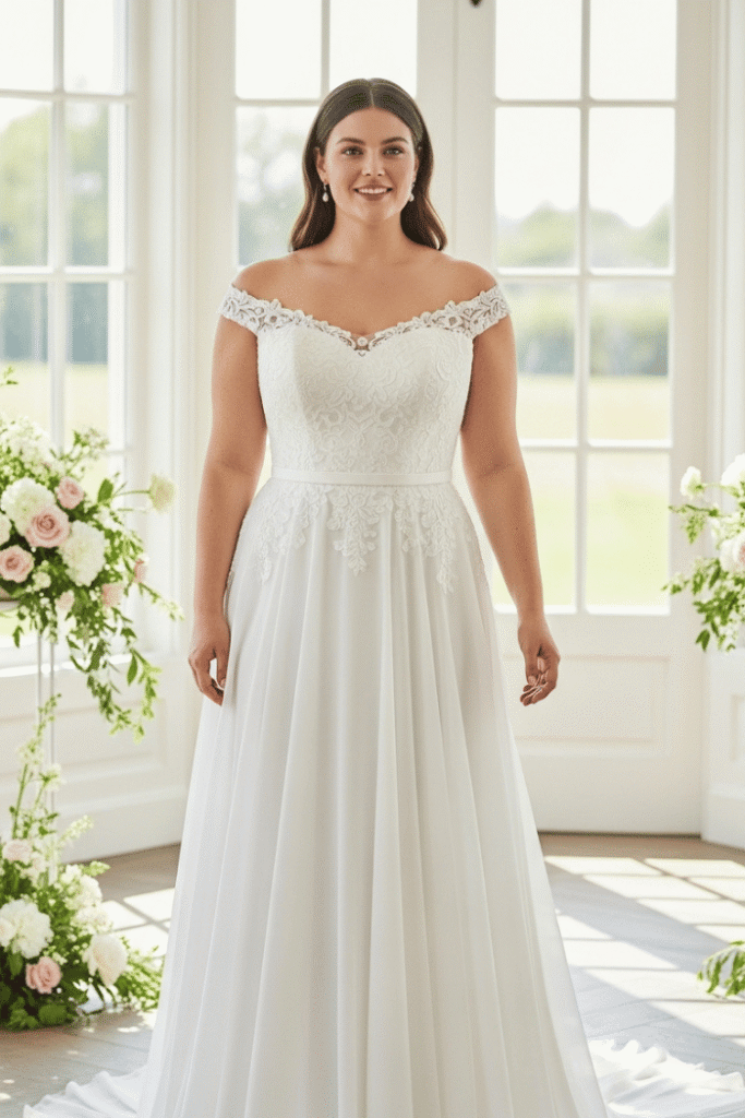 The A-line cut remains one of the most flattering silhouettes for plus-size brides. It highlights the waist while flowing gently over the hips.