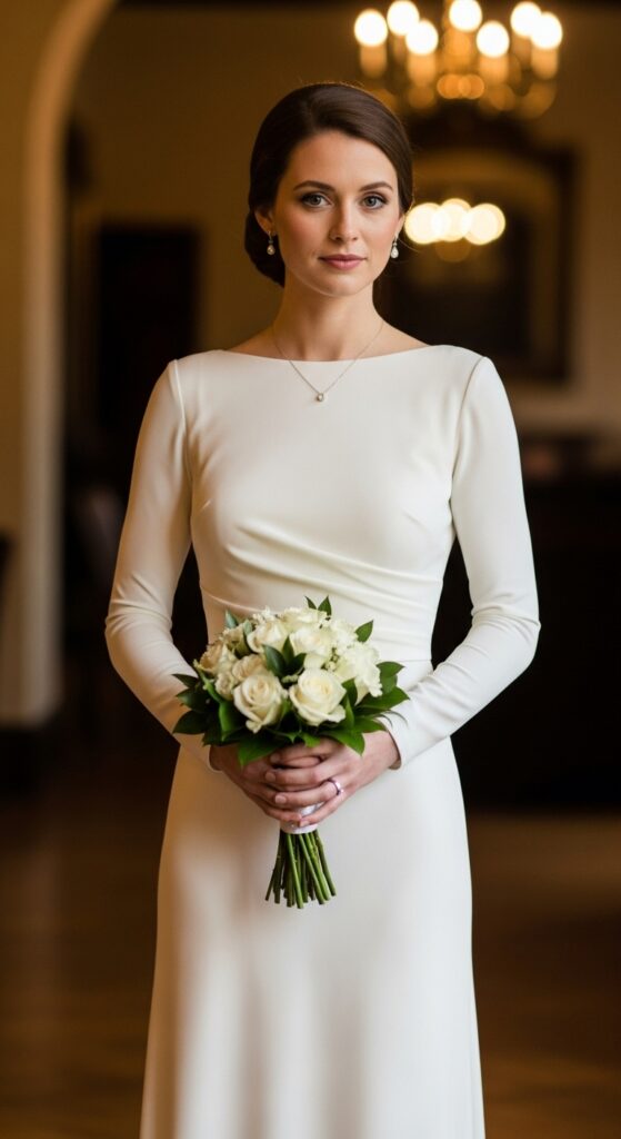Crepe fabric maintains shape, ensuring the gown remains elegant rather than bold. Add long sleeves or illusion mesh for coverage if desired. It’s perfect for confident, fashion-forward brides.