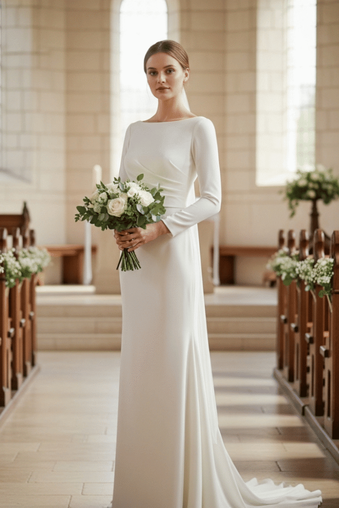 Sheath dresses hug the body, highlighting natural curves. Tall brides can carry this minimalist style effortlessly, especially in fabrics like satin or crepe.