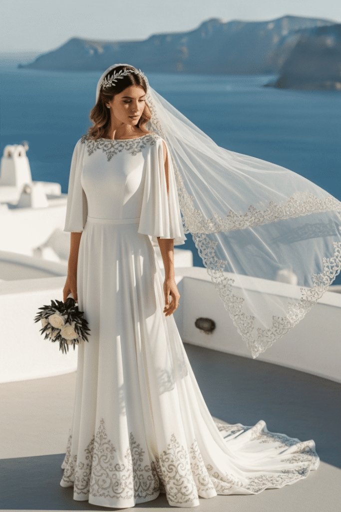 Greek bridal attire often features flowing fabrics, draped designs, and delicate embroidery, reflecting both ancient and modern influences. White or ivory gowns are common, emphasizing purity and elegance, while subtle gold or silver accents symbolize prosperity and good fortune.